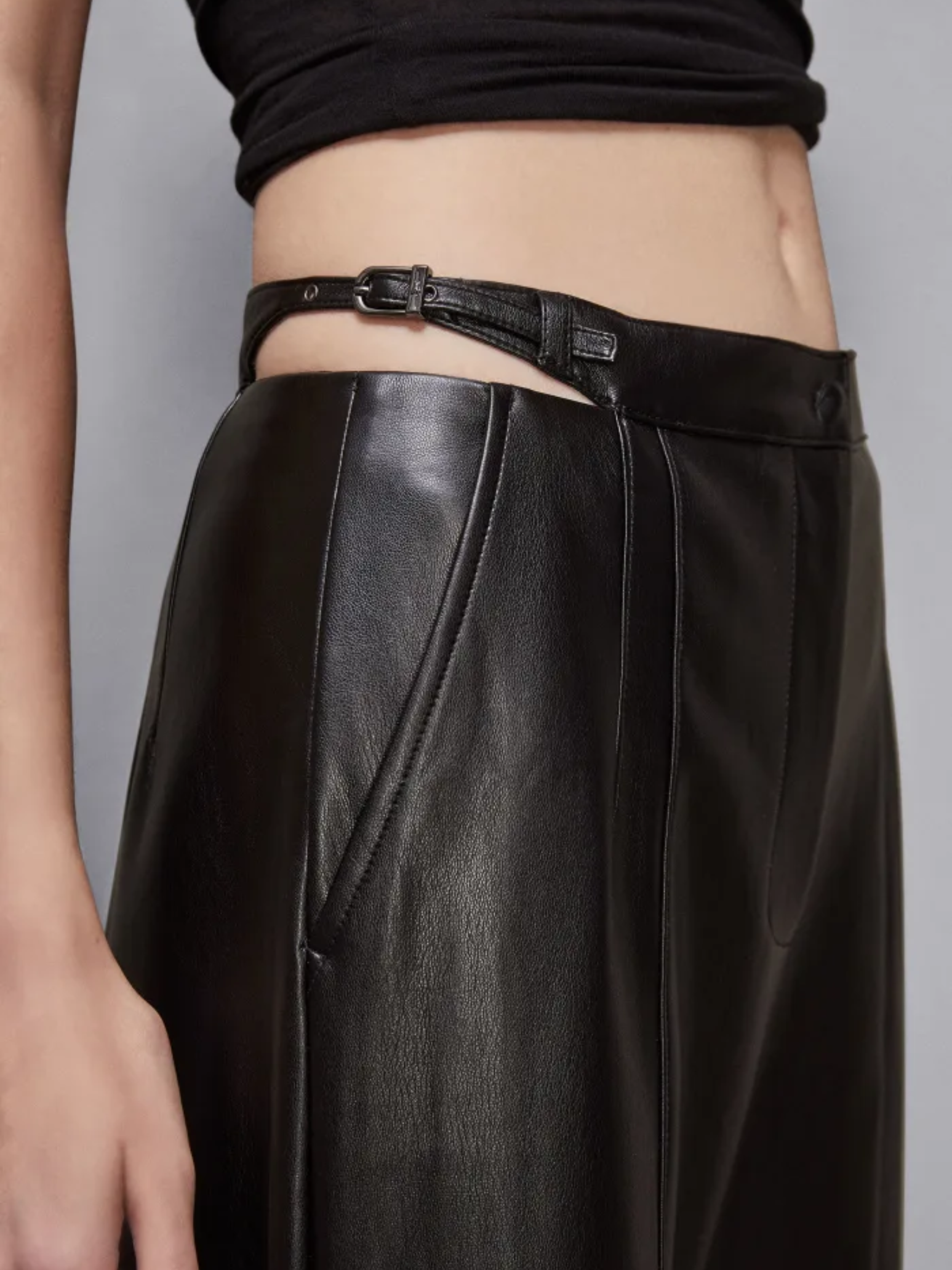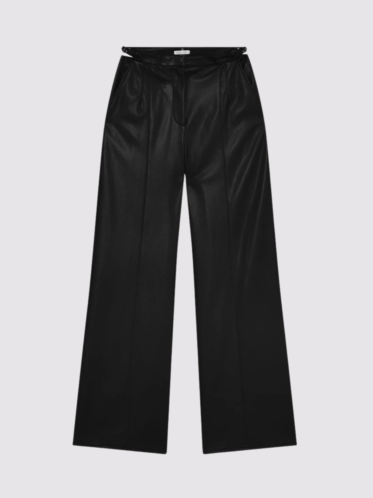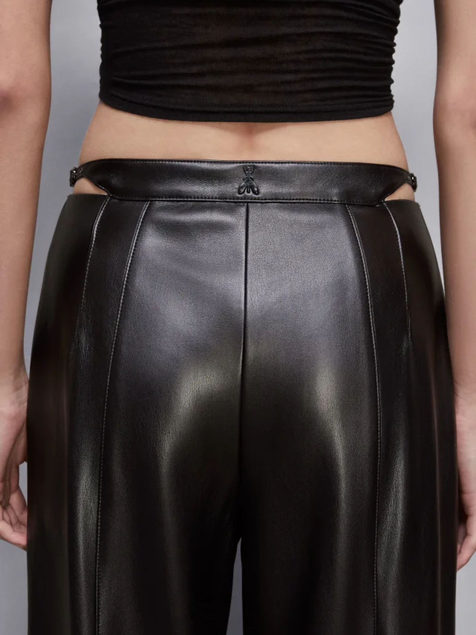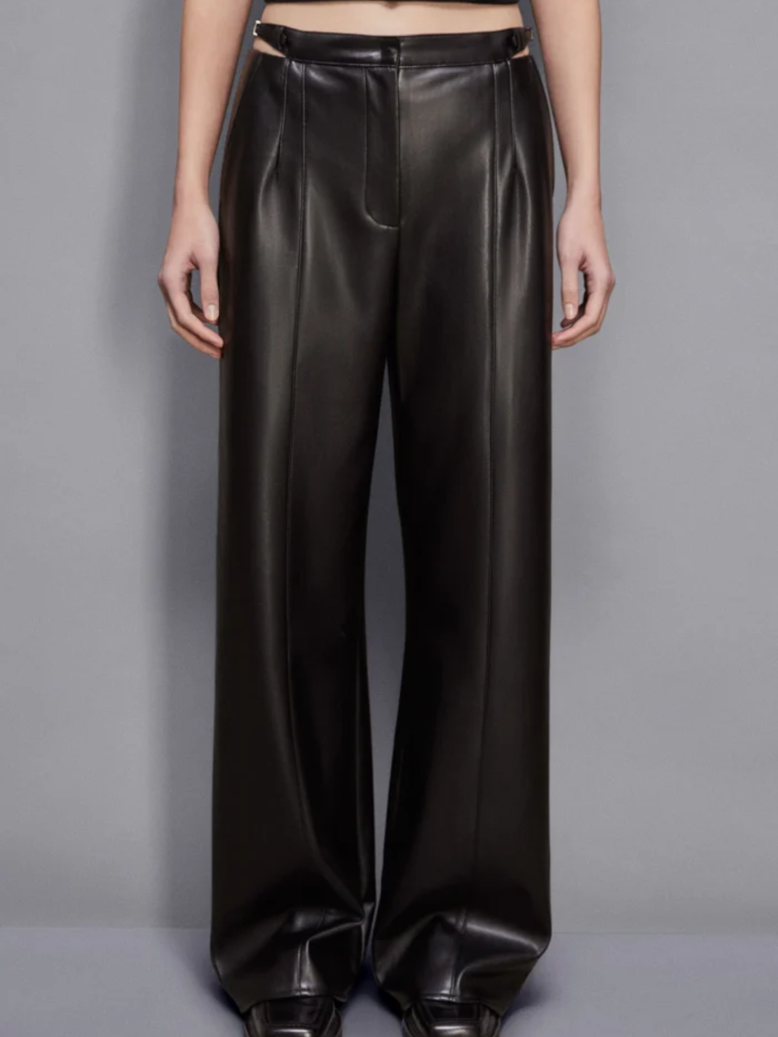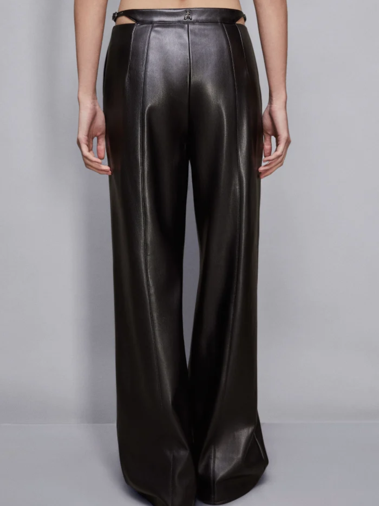 Questi pantaloni palazzo in tessuto spalmato aggiungono un'inconfondibile allure glam rock al tuo look, con una vestibilità slim che valorizza la silhouette. Gli slash laterali in vita e il cinturino con fibbie logate conferiscono un accento sensuale e audace, creando un contrasto perfetto tra raffinatezza e carattere.