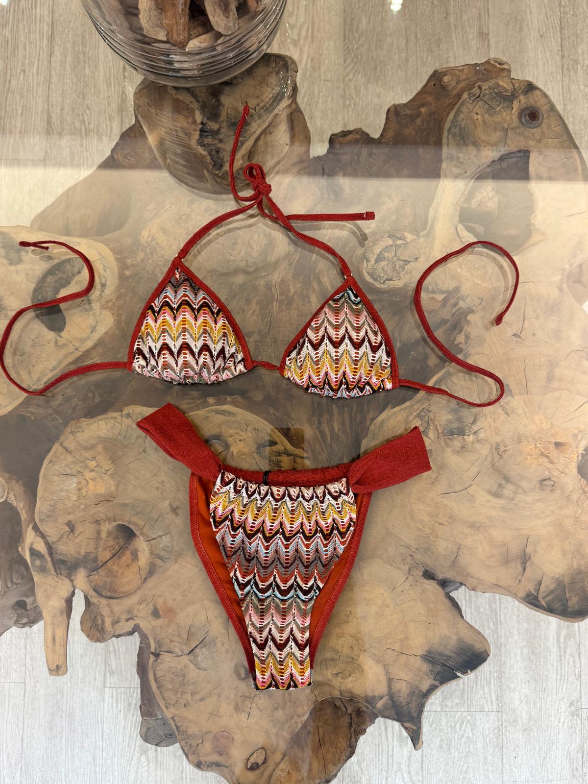 Bikini a fantasia geometrica con top regolabile a triangolo e slip brasiliano fisso, realizzato in tessuto elasticizzato.