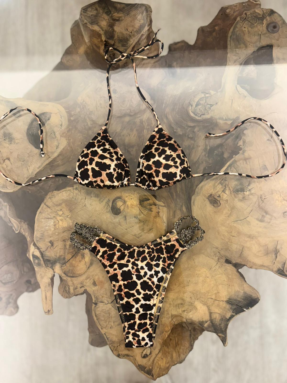 Bikini a fantasia animalier con top regolabile a triangolo e slip con lacci fissi, realizzato in tessuto elasticizzato.