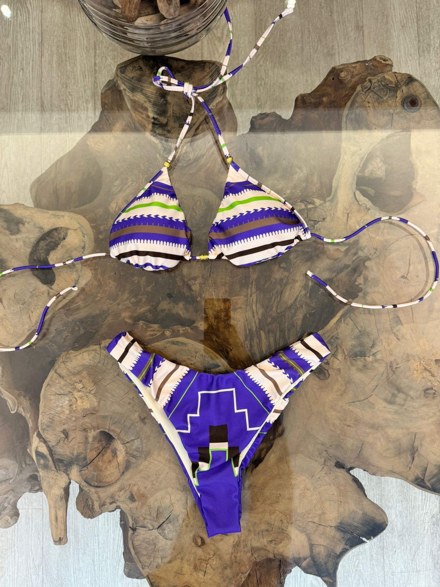 Bikini Multicolor Geometrico viola del brand MeFui. Slip americano brasiliana e top triangolo regolabile.