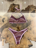Bikini a fantasia con top a fascia-triangolo e slip fisso, realizzato in tessuto elasticizzato.