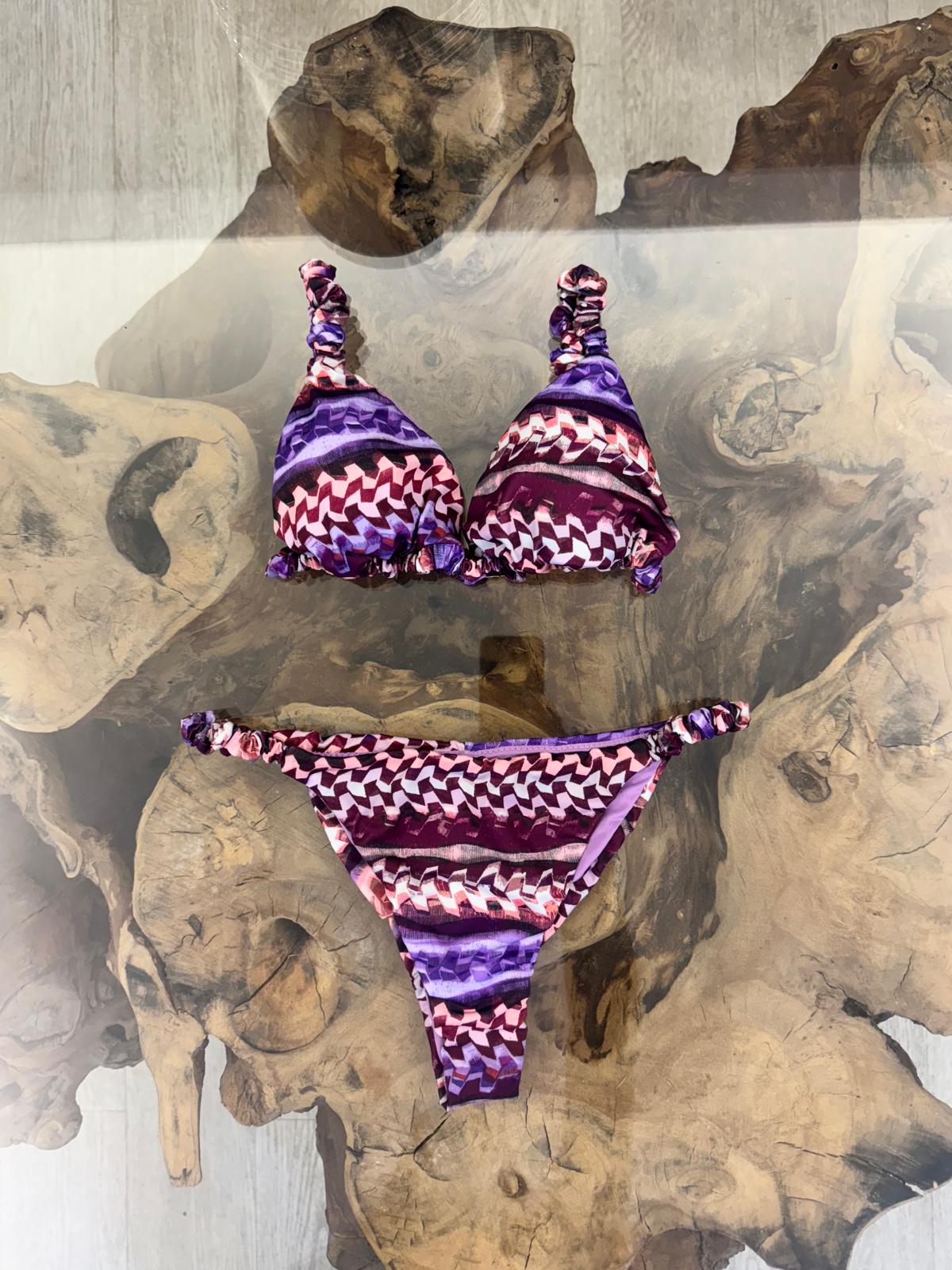 Bikini a fantasia con top a triangolo e slip fisso, realizzato in tessuto elasticizzato.