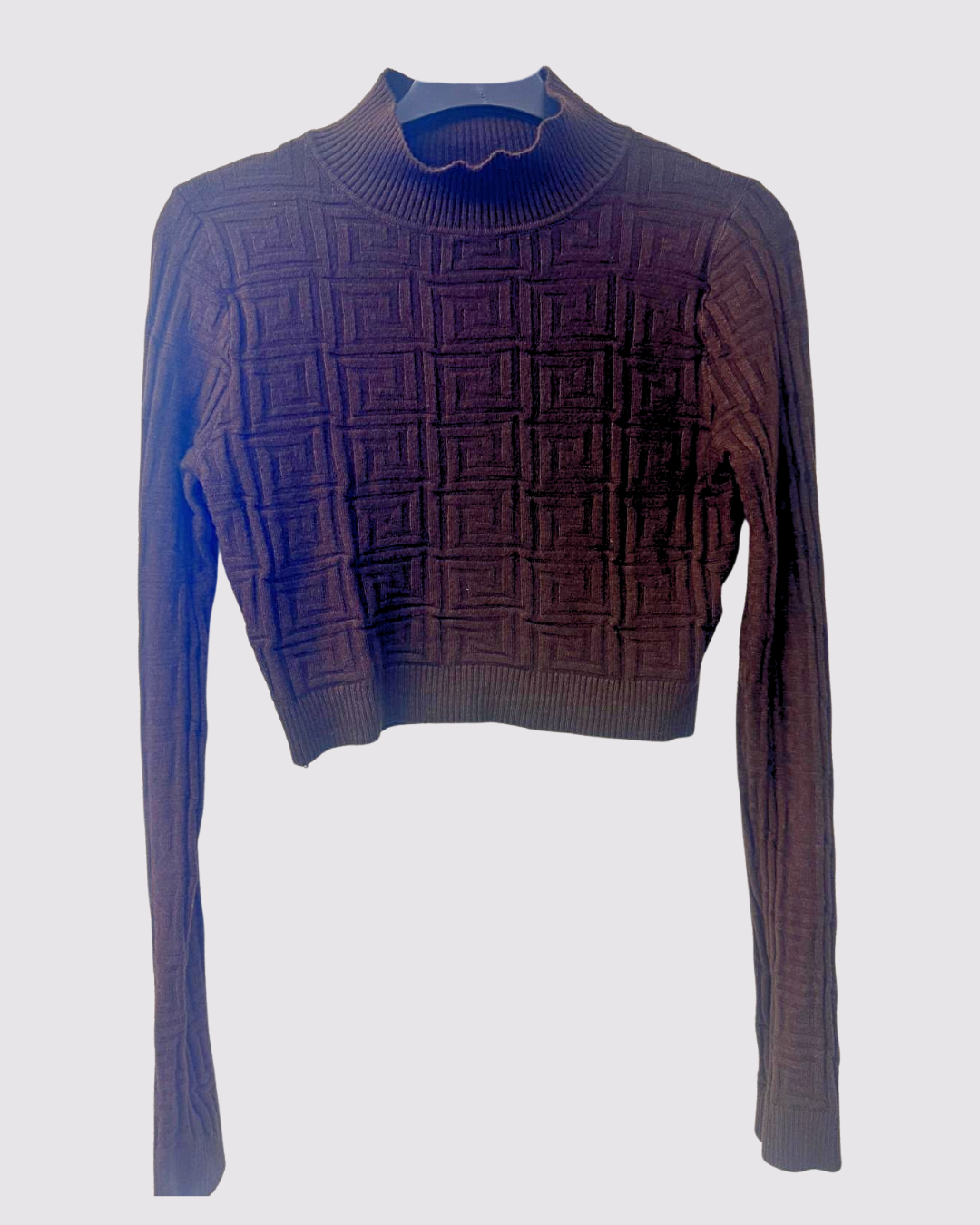 Maglioncino marrone crop, con collo e ricami. Maniche lunghe, taglia unica.