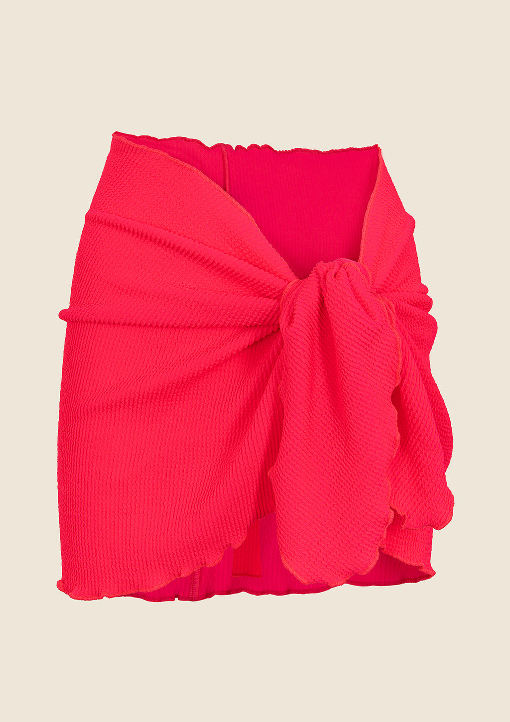 Pareo corto in Lycra goffrata, un tessuto leggero ed elasticizzato perfetto per completare il look da spiaggia con stile e praticità.